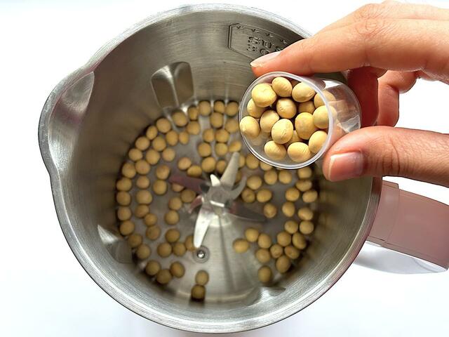 豆乳を家でつくろうとなると、乾燥大豆を水に浸してひと晩おき、ミキサーでなめらかにして、煮て漉す……と手間がかかりますが、この豆乳メーカーは乾燥大豆と水を入れて、スイッチを押して待つだけ。
