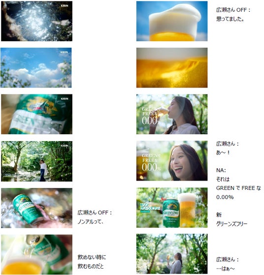 今年1月製造品よりリニューアルした「グリーンズフリー」は、従来の爽やかな味わいはそのままに、飲みごたえとホップの香りを向上させてさらにおいしくなりました。今回の新CMの舞台は、春の柔らかい木漏れ日が差し込む緑豊かな小川のほとり。水面にキラキラ反射する太陽の光を浴びながら、初めて「グリーンズフリー」を飲んだ広瀬アリスさんが、「ノンアルって、飲めない時に飲むものだと思ってました」と、その爽やかな味わいに気づき、発見していくストーリーになっています。リフレッシュしたい時や爽快な気分になりたい時にぴったりな「グリーンズフリー」のGREENでFREEな0.00%の魅力を訴求していきます。目を瞑っておいしそうに飲む姿や、飲んだ後の「はぁ~」という気持ち良さそうなリアクション、みずみずしさと爽やかさをまとった商品カットなど、自然の中に溶け込むかのように、ナチュラルで飾らない広瀬さんの表情が楽しめる新CMにご注目ください。