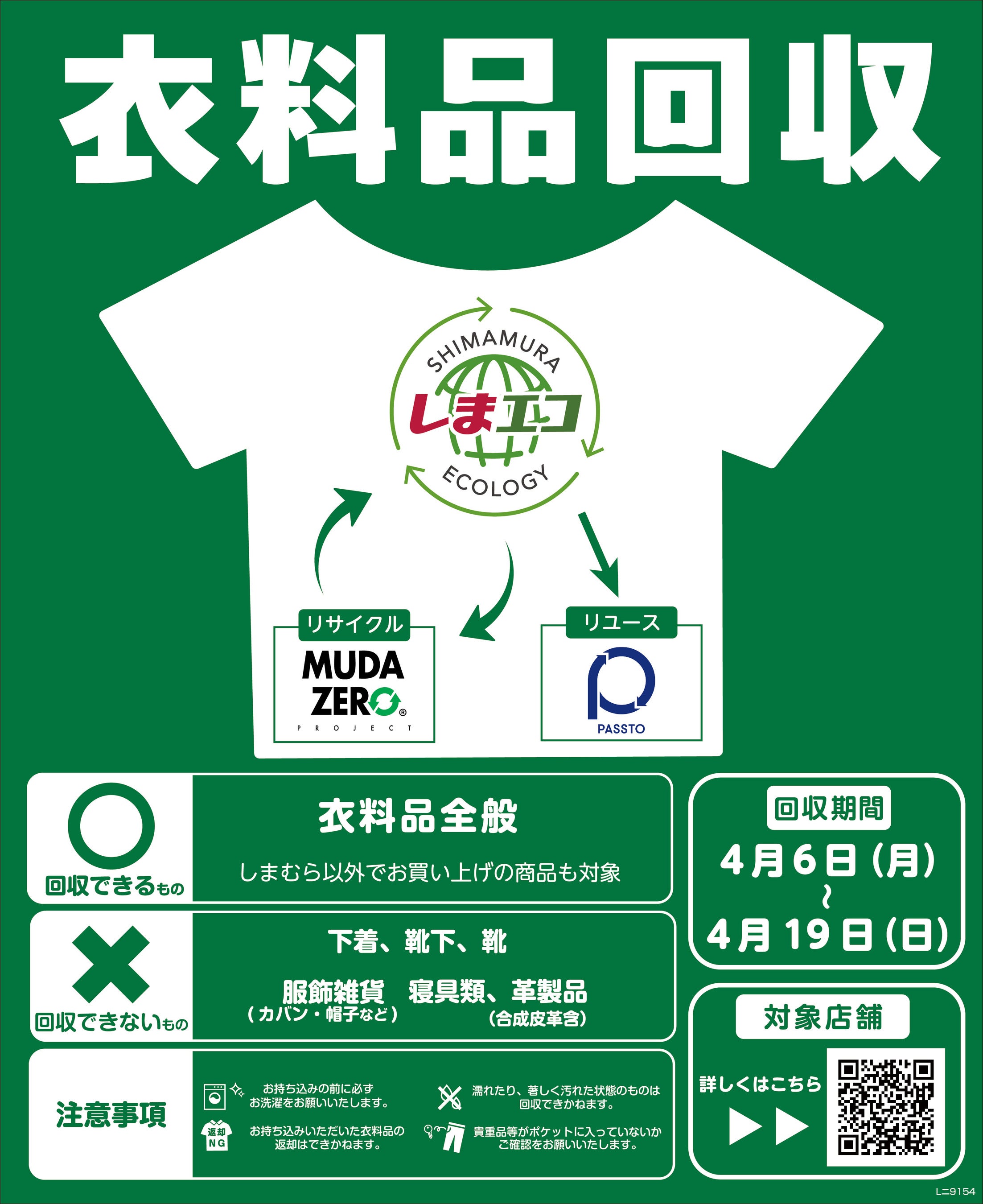 4/ 6(月)~ 4/19(日)までの期間、一部離島店舗を除くしまむらグループ全店舗にて「衣料品回収」を実施しています。■衣料品回収の目的