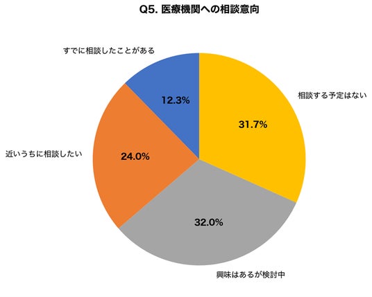 医療機関への相談に前向きな回答(「すでに相談した」「近いうちに相談したい」「興味はあるが検討中」)を合わせると68.3%となり、多くの方が医療的アプローチに関心を持っていることがわかりました。一方で3割以上が「相談する予定はない」と回答しており、医療的選択肢の認知度向上が課題といえます。