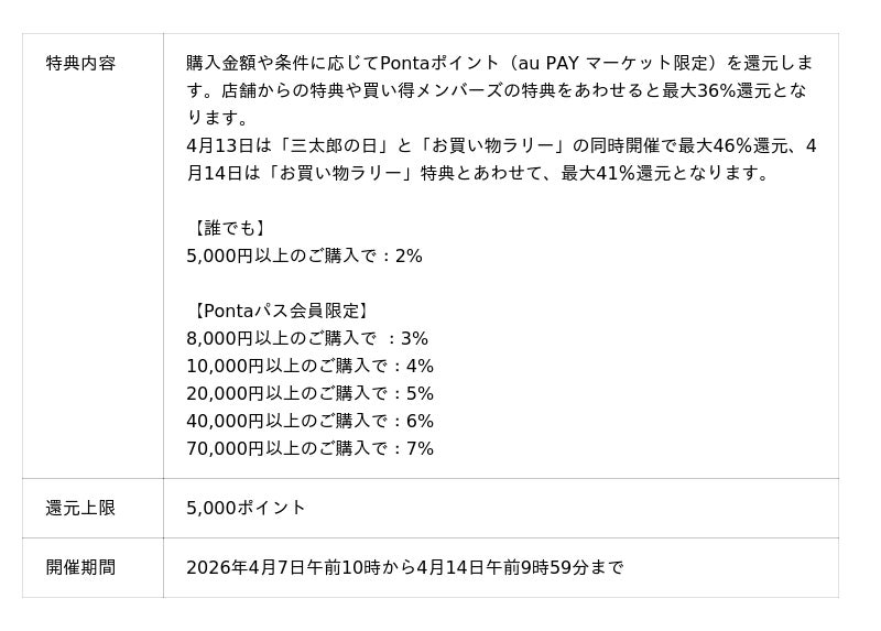 さらに、4月13日は「三太郎の日」と「お買い物ラリー」の同時開催により最大46%還元、最終日の4月14日は「お買い物ラリー」との連動で最大41%還元と、期間中を通してお得なチャンスが続きます。