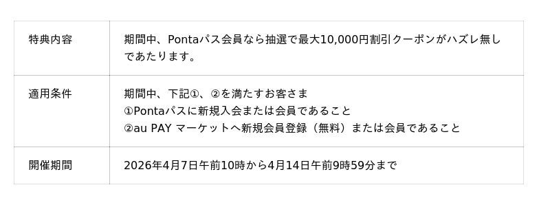 auコマース&ライフは、2026年4月7日から4月14日までの期間、総合ショッピングサイト「au PAY マーケット」で、おトクな特典を提供する「ポイント超超祭」(以下、本キャンペーン)を開催します。ポイント超超祭では、購入金額に応じて最大7%のPontaポイント(au PAY マーケット限定)を還元し、店舗からの特典や買い得メンバーズの特典をあわせると最大36%還元となります。