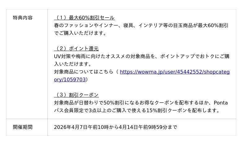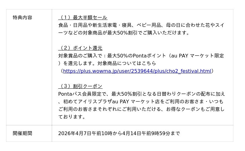 加えて今回は、家電・日用品の「アイリスプラザ」とファッション・寝具の「ニッセン」の人気ブランドとタッグを組み、最大60%割引セールやポイント最大50%還元というおトクな特典を提供します。新生活の家電や寝具、ストックしておきたい日用品はもちろん、母の日ギフトから、衣替えに合わせた春のファッションやインナーまで幅広くラインアップし、新生活の「買い足し」から季節行事の準備まで、あらゆるお買い物がおトクにお楽しみいただけます。