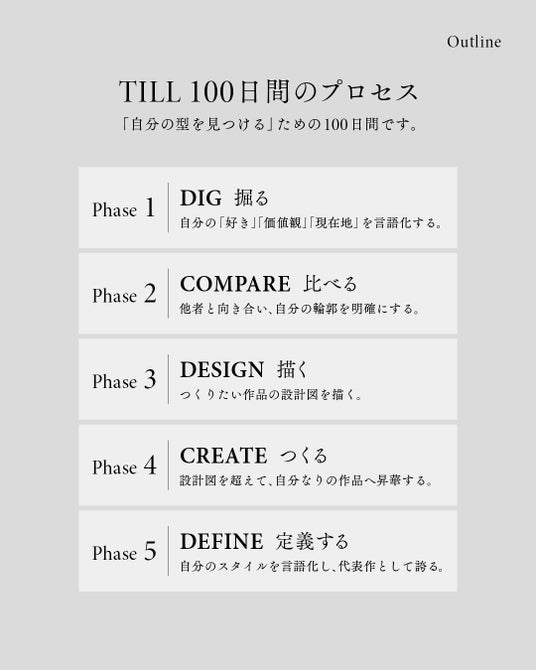 TILLは、映像クリエイターを対象に、「自分のクリエイティブコアを確立する」ことを目的とした100日間受講生と講師が伴走する実践型プログラムです。