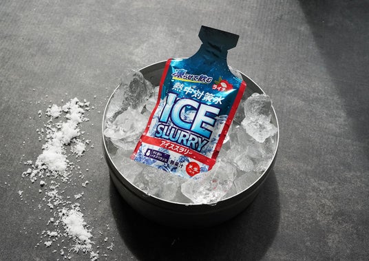 アイススラリーとは、液体の中に微細な氷の粒が混ざったシャーベット状の飲料です。氷の冷却効果と飲料の流動性を併せ持ち、口から素早く体内へ氷を届けることができます。氷の粒が細かいため表面積が大きく、効率よく体温を下げることが可能です。