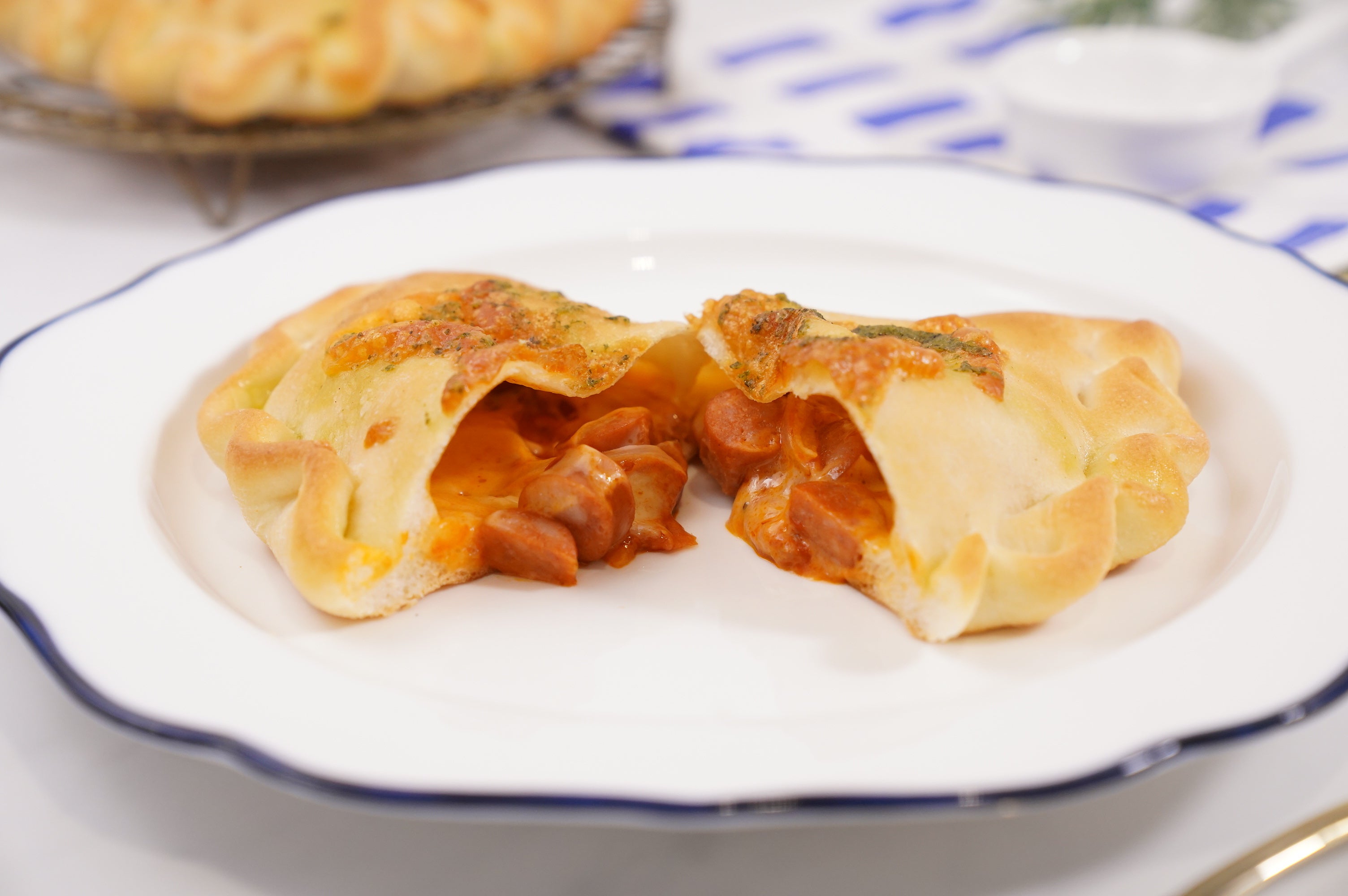 商品コメント:トマトソースとオニオン、チーズ、チョリソーを包んだ、具沢山のカルツォーネ。バジルオリーブオイルがアクセント。