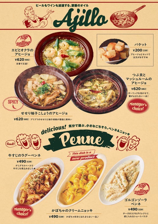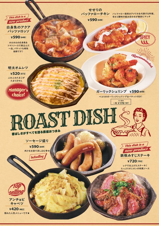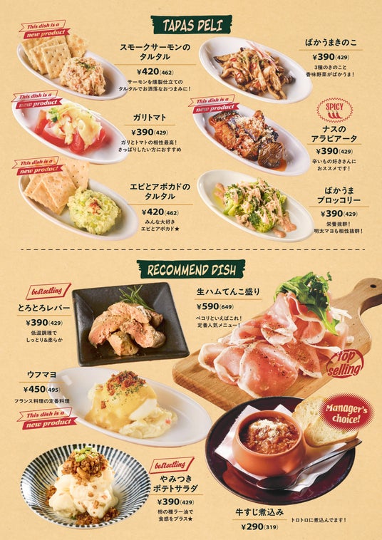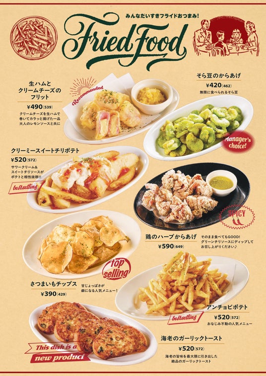 本リニューアルでは、これまでの人気メニューに加え、より多様なシーンでお楽しみいただけるラインナップへと拡充。洋風居酒屋としての魅力をさらに高め、幅広いお客様にお楽しみいただけるメニュー構成となっております。