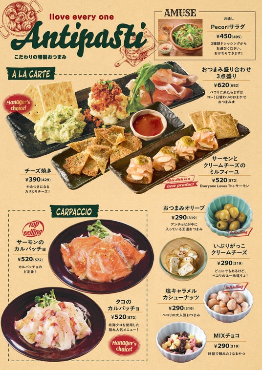 飲食企業の株式会社ファイブグループ(本社:東京都武蔵野市 代表取締役社長:坂本憲史 以下ファイブグループ)が展開する「洋風居酒屋 Pecori(ペコリ) 」は、2026年4月6日(月)から全8店舗にて、グランドメニューを刷新し、新メニューの提供を開始いたします。