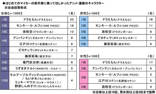また、はじめてのマイカーの助手席に乗ってほしかったアニメ・漫画のキャラクターを聞いたところ、1位「ドラえもん(ドラえもん)」(33名)、2位「モンキー・D・ルフィ(ONE PIECE)」(16名)、3位「孫悟空(ドラゴンボール)」(12名)、4位「アンパンマン(それいけ!アンパンマン)」「江戸川コナン(名探偵コナン)」(いずれも8名)となりました。