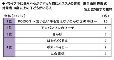 ◆ドライブ中に赤ちゃんがぐずった際にかけたい音楽 1位「POISON~言いたい事も言えないこんな世の中は~」「アンパンマンのマーチ」