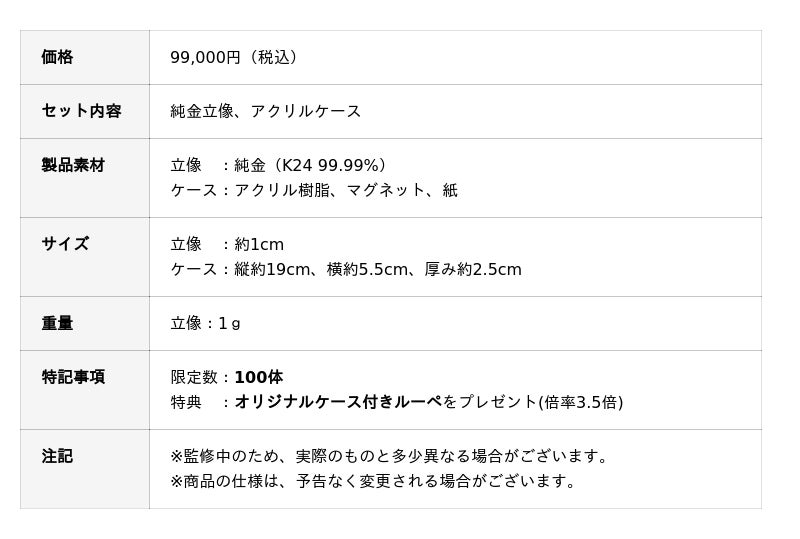 純金立像、シルバー立像購入者全員にオリジナルケース付きルーペをプレゼント!