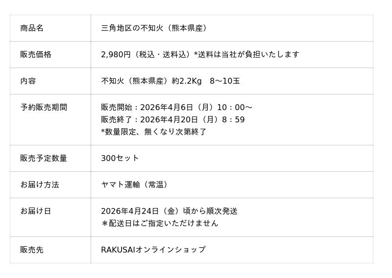 d130004-133-7707e627979cd27313b6c4a1c232ed52.pdf楽彩株式会社(本社:東京都足立区/代表取締役社長:大崎善保)は、2026年4月6日(月)より『三角地区の不知火』(熊本県産)を300セット限定で予約販売いたします。RAKUSAIのバイヤーが「熟成の極み」とも言える不知火を厳選。より多くの方に楽しんでいただけるよう、2,980円(税込・送料込)という特別価格で全国へお届けいたします。名産地・熊本県三角地区の濃厚な味わいを、ぜひこの機会にご賞味ください。