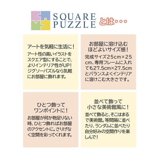 「スクエアパズル」は、やのまんが展開するオリジナルフォーマットのジグソーパズルシリーズです。完成サイズが25×25cmの正方形で、一般的な長方形パズルとは一線を画すスタイリッシュなシルエットが特徴です。完成後はそのままインテリアとして飾れるほか、別売りの専用フレームを使って好みの色でディスプレイすることができ、コレクションとしての楽しさも魅力のひとつです。アートとしてのクオリティにこだわったデザインと、手軽に楽しめる306ピースというピース数により、パズル初心者からベテランまで幅広くお楽しみいただけます。