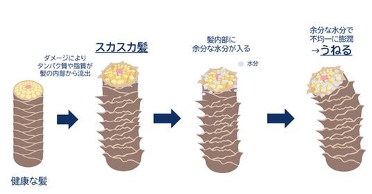 ヘアアイロンなどの熱ダメージ、ヘアカラーやブリーチなどで髪がダメージを受けると、毛髪内部からたんぱく質や脂質などが流出し毛髪内部は「スカスカ」の状態になってしまいます。その隙間に余分な水分が入り込むと、髪がうねる要因となってしまいます。