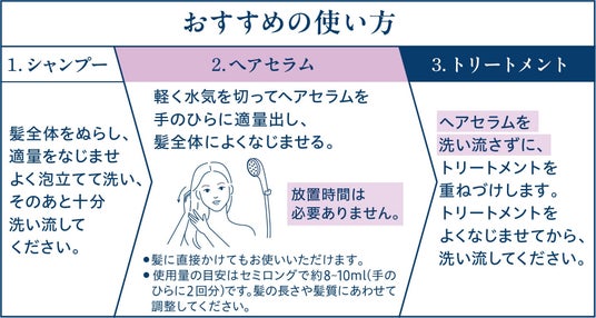『MEGAMIS』は従来のクリーム状のトリートメントでは美容液成分(※1)が髪に浸透しにくい(※5)ことに着目し、シャンプーとトリートメントの間に、高濃度浸透処方のヘアセラムを使用する習慣を提案。ヘアセラムをすすがないままトリートメントでパックすることで、美容液成分(※1)がたっぷり髪の芯まで浸透し、女神級の美髪へと導きます。