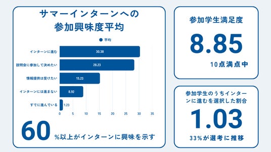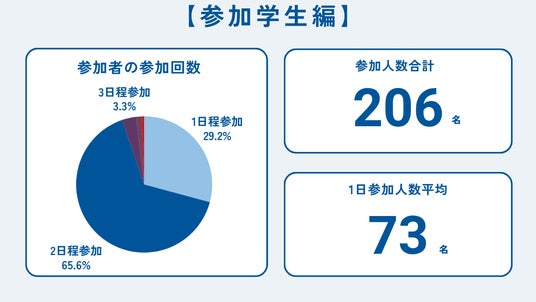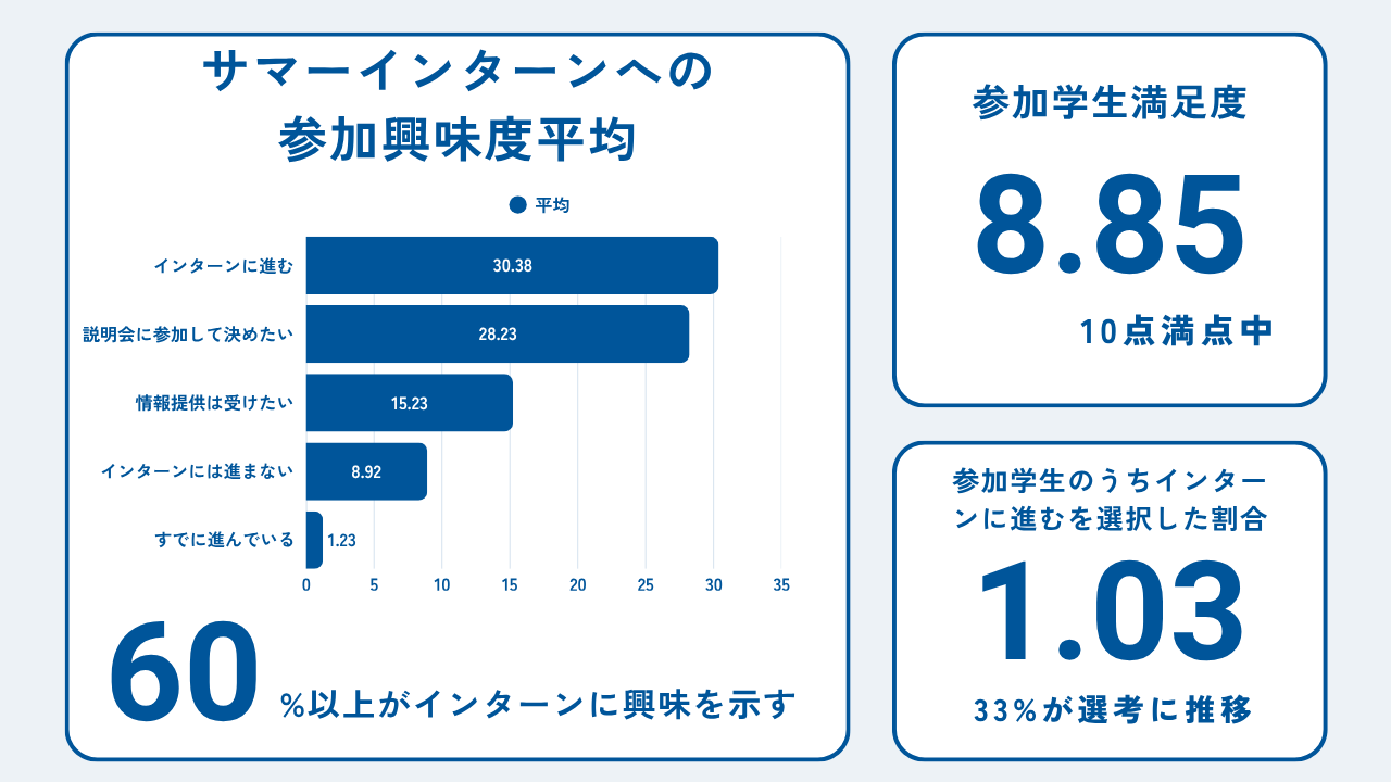 全国から206名の感度の高い学生が参加し、参加者の約33%が参加企業のサマーインターンシップの選考へ進むなど、企業の母集団形成において極めて高いROI(費用対効果)を実証する結果となりました。