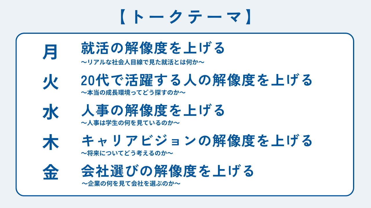 「就活を何から始めたら良いのか分からなかったので、自己分析や企業選びのコツを実際の人事の方から聞けたのが良かった。」