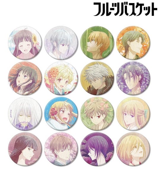 本田透、草摩由希、草摩夾、草摩紫呉、草摩楽羅、草摩紅葉、草摩潑春、草摩はとり、草摩綾女、草摩杞紗、草摩燈路、草摩利津、草摩依鈴、草摩紅野、草摩慊人、本田今日子のエンディングの印象的なシーンを和紙風の缶バッジに仕上げました。