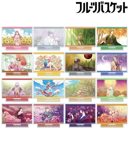 本田透、草摩由希、草摩夾、草摩紫呉、草摩楽羅、草摩紅葉、草摩潑春、草摩はとり、草摩綾女、草摩杞紗、草摩燈路、草摩利津、草摩依鈴、草摩紅野、草摩慊人、本田今日子のエンディングの印象的なシーンをアクリルスタンドに仕上げました。