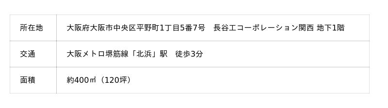 当施設は、大阪メトロ堺筋線「北浜」駅から徒歩3分の場所に所在する長谷工コーポレーション関西の地下1階に誕生し、デベロッパーや建替え・再開発組合などのお客様を対象に当社およびグループ各社の取り組みと連携が生み出す技術開発、商品・サービスのプロモーション施設として運営してまいります。
