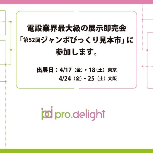 電話のDXを推進する株式会社プロディライト(大阪市中央区:代表取締役社長 小南 秀光、証券コード:5580、以下プロディライト)は、ジャンボびっくり見本市協催委員会主催の展示即売会「第52回ジャンボびっくり見本市」に4月17日(金)・18日(土)・24日(金)・25日(土)の4日間、製品ライフサイクル全体を支援する因幡電機産業株式会社(大阪市西区:代表取締役社長 玉垣 雅之、証券コード:9934、以下因幡電機産業) eソリューション課のブースにて出展いたします。