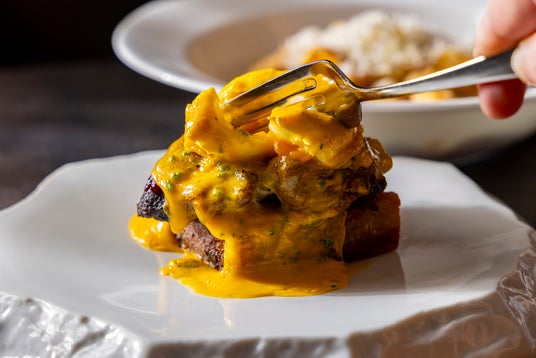 フリーレンジポーチドエッグ、ベアルネーズ、赤玉ねぎのピクルス、スパイシーバーベキューソース