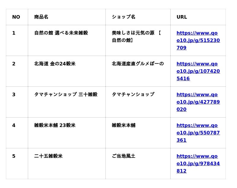 Qoo10「雑穀ミックス」販売数ランキング