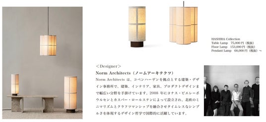 日本の伝統的な和紙職人から着想を得て、Norm Architects(ノームアーキテクツ)が生み出したのがHashira Collection(ハシラ・コレクション)です。東洋と西洋、伝統とモダン。その融合を体現する本コレクションは、フロア、テーブル、ウォール、ペンダント、シーリング、ポータブルと、多彩なラインアップで展開します。円柱形のフォルムに、静けさとプロポーション、シンプルさと個性の絶妙なバランスを映し出しています。素材には、ウッドとリネンを採用。計算された異素材の組み合わせにより、空間にやわらかな光と、ほのかな質感をもたらします。