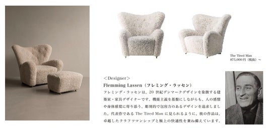The Tired Man(ザ・タイアードマン)The Tired Man(ザ・タイアード・マン)は、1935年に開催されたコペンハーゲン家具職人組合展(Copenhagen Cabinetmakers’ Guild Exhibition)で発表され、以来、デンマークデザインを象徴するアイコンとして愛され続けています。卓越したクラフツマンシップと、極上の座り心地を体現するこのアームチェアは、デザイナー Flemming Lassen (フレミング・ラッセン)によって、「母熊の腕に抱かれたホッキョクグマの子どものように、温かく包み込まれる感覚」を目指してデザインされました。その特徴的な曲線フォルムは、身体をやさしく受け止め、深い安らぎをもたらします。