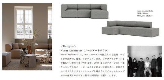 ブランドを代表するシグネチャー・コレクションには、歴史的名匠によるアイコニックなデザインと、現代を象徴するコンテンポラリーデザインが共存しています。アーノルド・マドセンによるOda Chair、イブ・コフォード=ラーセンのThe Seal ChairやThe Penguin Chairなどに代表される、歴史的名匠によるデザインに加え、現代において活躍するデザイナー、ノームアーキテクツによるEave Modular SofaやHashira Lighting Collectionなど、数多くのオリジナリティ溢れるプロダクトを展開しています。
