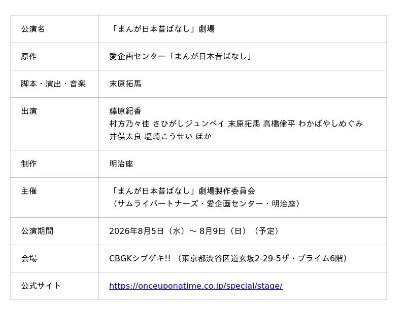 人の優しさや欲への戒め、自然との共生――日本人が古くから大切にしてきた心のあり方を、あらためて感じていただけるひとときに。アニメを通じて親しんできた大人世代から、これから「まんが日本昔ばなし」に出会う子どもたちまで親子三世代で楽しめる、懐かしくてあたたかい、思わず引き込まれる不思議な魅力に満ちた、夏の特別なエンターテインメントをお届けします。演目およびチケット情報、そして子役オーディションの詳細は、続報にてご案内いたします。どうぞご期待ください。