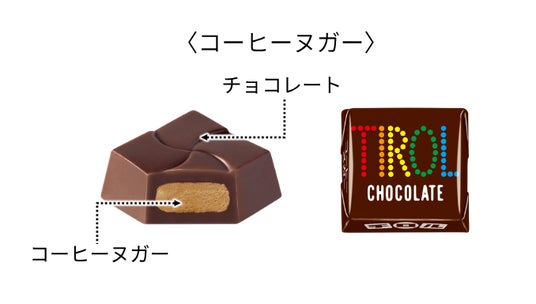 ■コーヒーヌガー1979年登場!ほんのりビターなコーヒーヌガーとチョコレートの甘さの絶妙なバランスがクセになる、根強い人気の定番チロルチョコです。