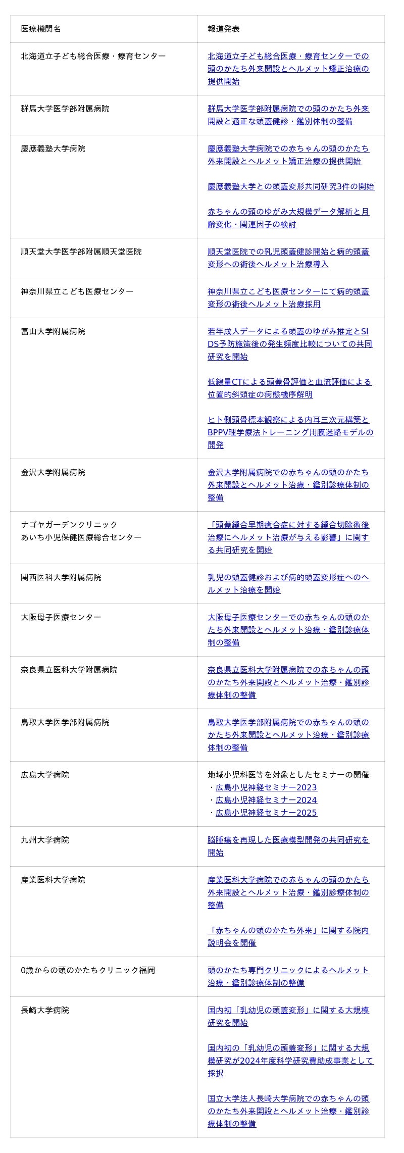 上記の各医療機関における「赤ちゃんの頭のかたち外来」の開設や当社との共同研究など、乳児の頭蓋健診や頭蓋矯正治療等に関する報道発表は以下のとおりです。