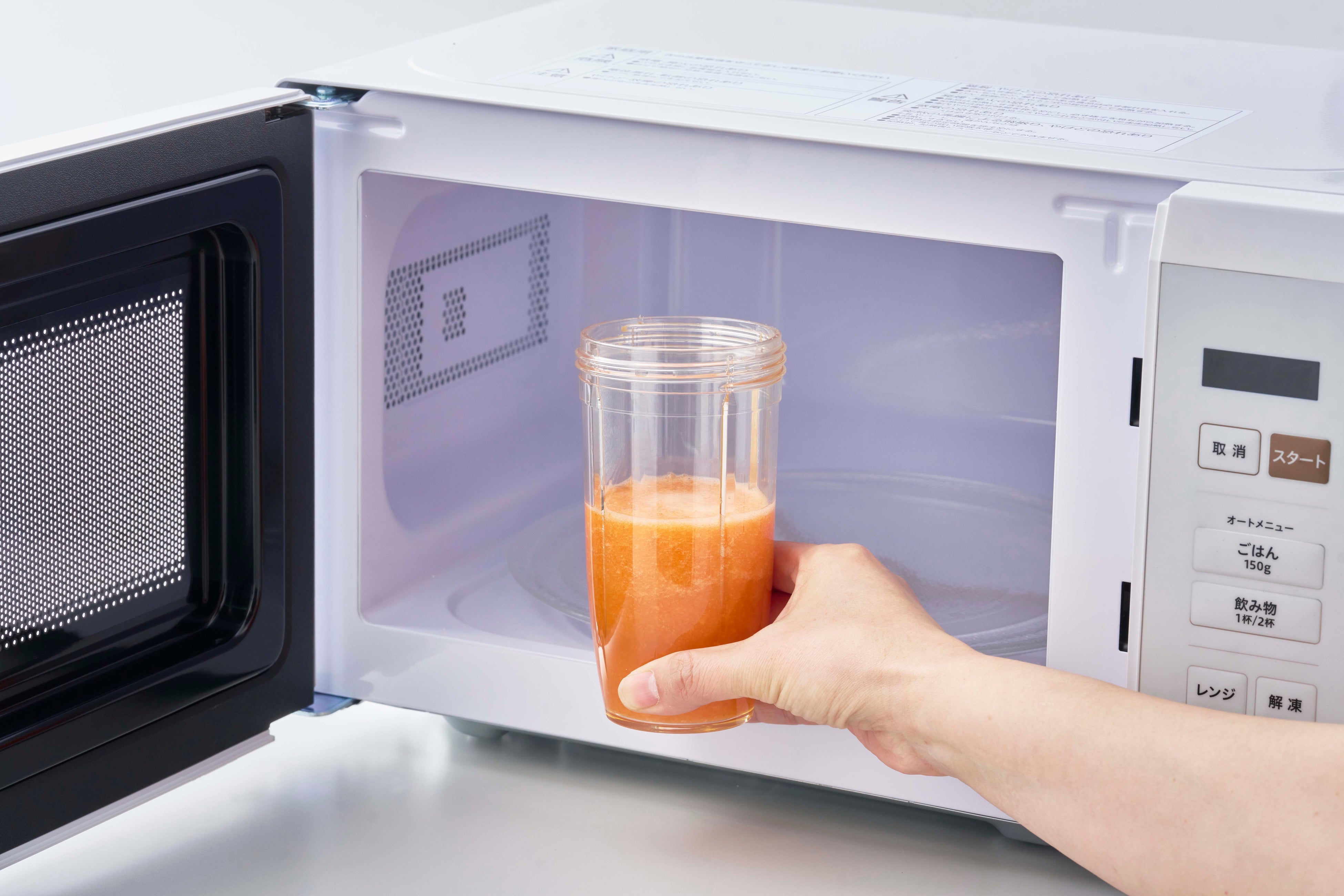 容器には、耐熱性・耐久性に優れた高機能樹脂「PAR(ポリアリレート)」を採用しました。一般的なガラス容器に比べて比重が軽く、割れにくい素材の特性を生かすことで、シリーズ最軽量を実現しています。調理時や洗浄時に扱いやすく、食品粉砕後は容器を移し替えずそのまま電子レンジで加熱できるため、ポタージュやジャム、ホットスムージーといったメニューも効率よく調理することが可能です。