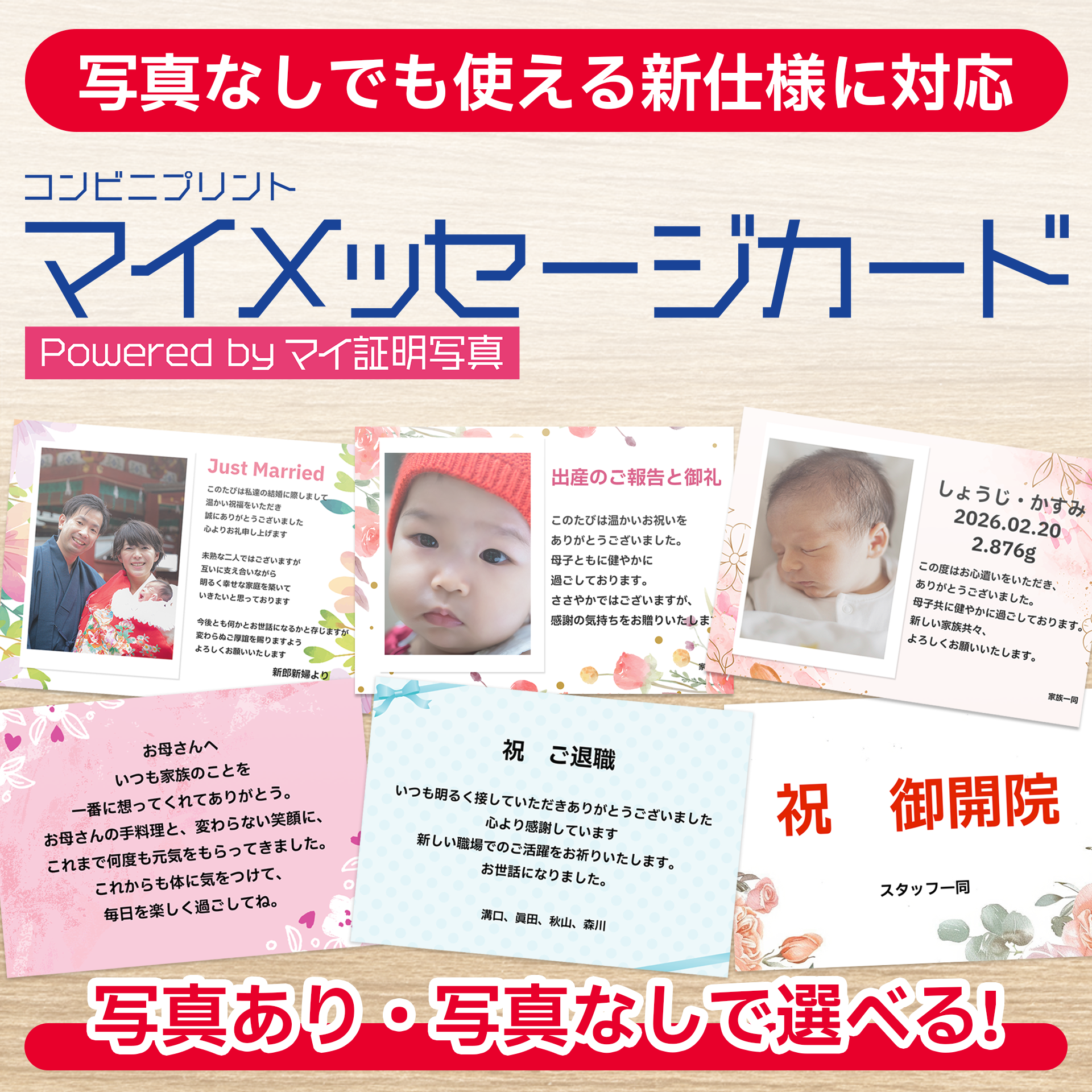 コンビニプリントサービス『マイメッセージカード』は、写真なしデザインに対応し、より使いやすくリニューアルしました。