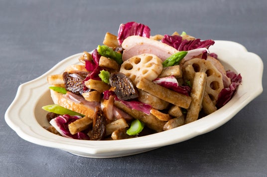 オリーブ&バルサミコビネガー薫る 合鴨のイタリアンごぼうサラダ大きめに切ったごぼうとれんこんを焼き上げ、しっとり柔らかな合鴨ローストと合わせたご馳走サラダ。バルサミコ酢にすりおろしたオリーブや赤ワインを合わせたドレッシングのコクと酸味が具材の美味しさを引き立て、イタリアンな味わいを演出します。時折、顔を出すドライいちじくの甘みが軽妙なアクセントに。ワインのおつまみにどうぞ。