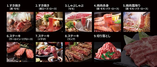 - 食べ方:すき焼き(肩・モモ)/すき焼き(肩ロース・ロース)/しゃぶしゃぶ(モモ)/焼肉赤身(肩・モモ・バラ ・ロース)/焼肉霜降り(肩・モモ・バラ ・ロース)/ステーキ(サーロイン・リブロース)/ステーキ(イチボ)/ステーキ(ランプ)/切り落とし