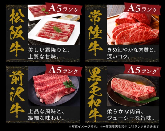 - 銘柄:松阪牛/常陸牛/前沢牛/国産黒毛和牛