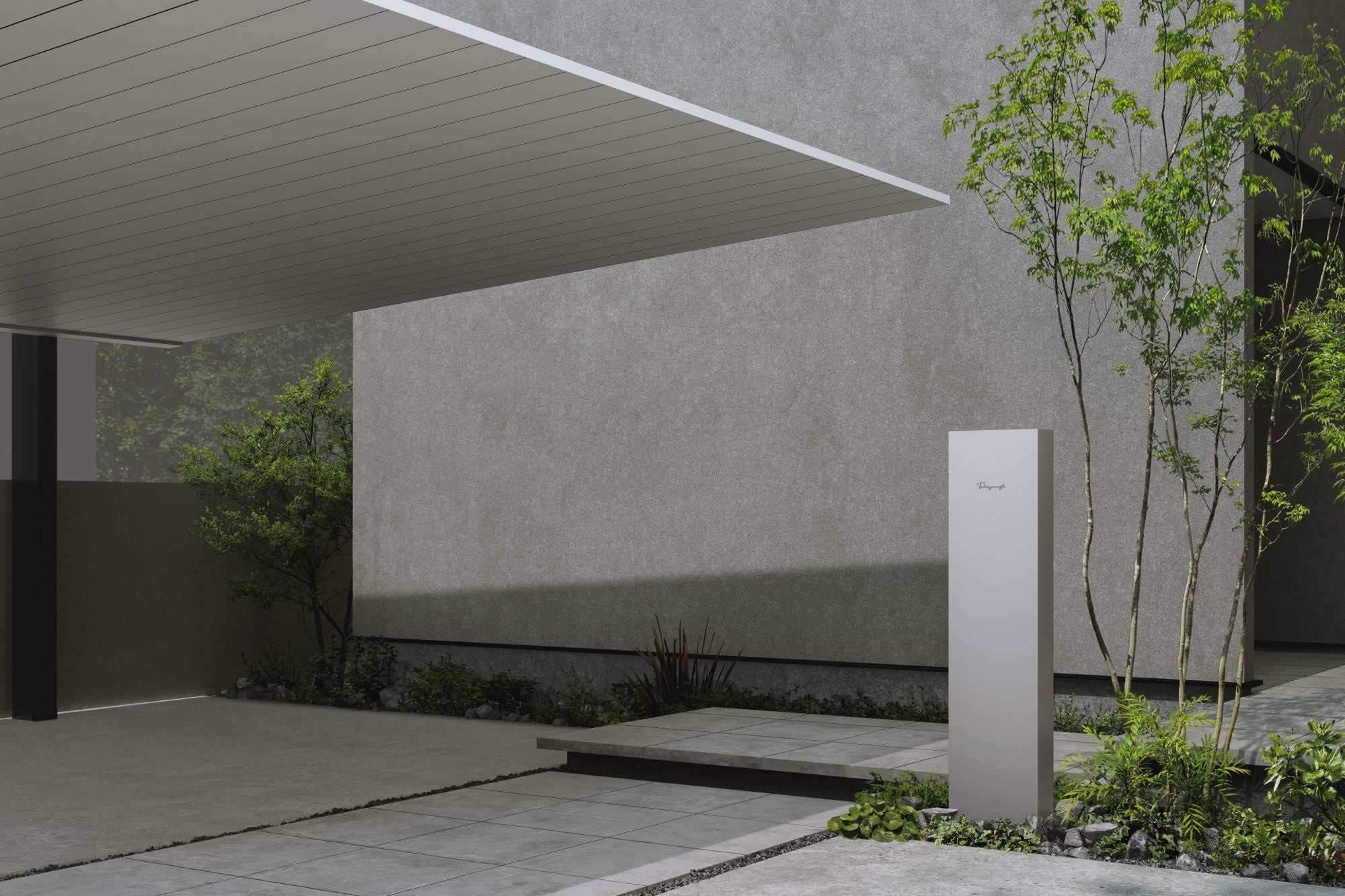 シリーズ第一弾となるポストユニットは住宅のエントランスに設置する、表札・インターホン、郵便ポスト・宅配ボックス、照明などを一体化した機能ポールです。必要な機能を一つの柱にまとめることで省スペース化や外観の統一感、利便性、防犯性の向上等の様々なメリットがあります。近年の住宅はオープン外構とシンプルな外観デザインの増加により、住まいの利便性とトレンドを同時に叶える需要が高まっています。そこで住宅のエントランスに必要な機能を集約しながらトレンドである水平・垂直基調のフォルム、洗練されたディテールで住宅に調和するアイテムとして「オルフェス ポストユニット」をラインアップしました。