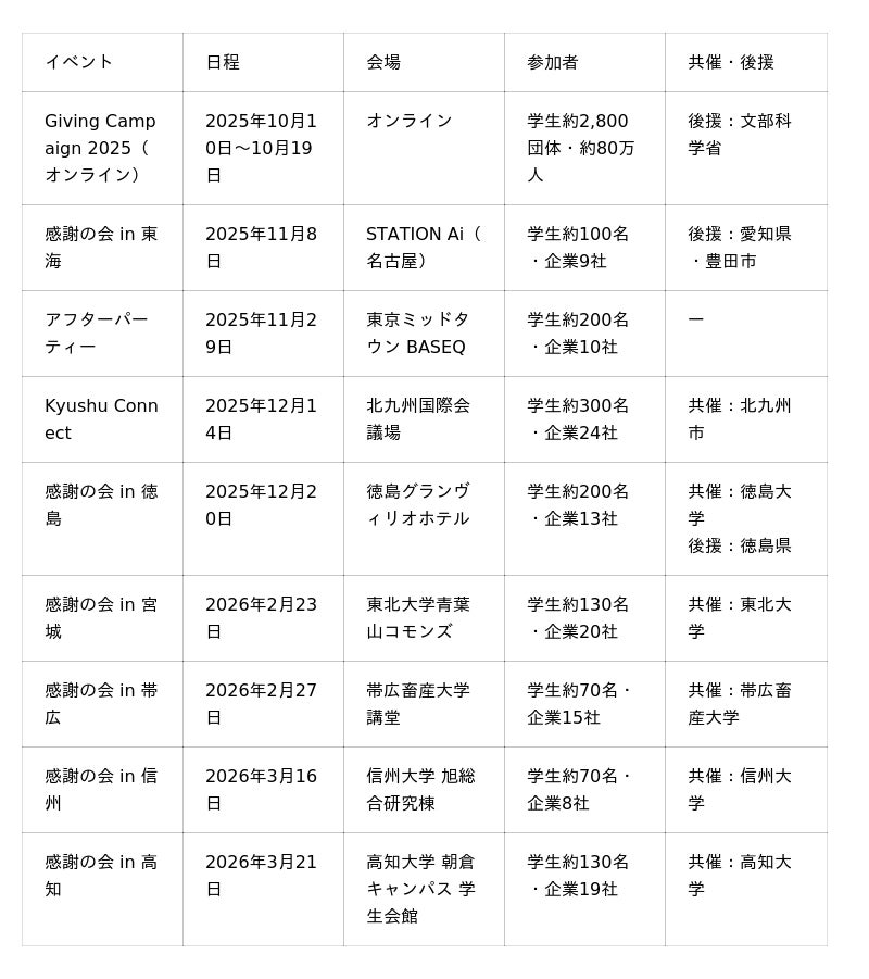 次回「Giving Campaign 2026」では、参加学生団体3,000団体、アフターイベントを全国19箇所で開催することを目指しています。2025年の8会場から大幅にスケールアップし、より多くの地域で学生と企業・地域社会の新たな繋がりを生み出してまいります。引き続きご支援・ご注目をよろしくお願いいたします。