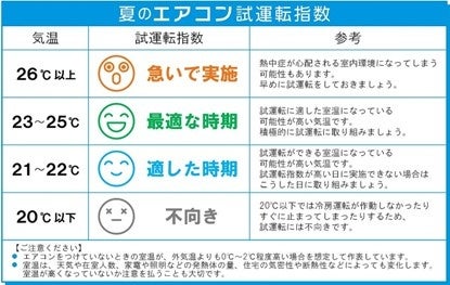 ダイキンは、試運転を行うのに適した気温やタイミングを分かりやすく把握できる目安として、「夏のエアコン試運転指数」を2023年に考案しました。天気予報で報じられる気温と照らし合わせれば、試運転に適した日が一目で分かります。気温23~25℃を「最適な時期」として、21~22℃を最適に次ぐ「適した時期」、20℃以下を「不向き」としています。また、気温が26℃を超えた場合、熱中症の心配も出てくる※3ことから、急いで実施いただくことを促します。