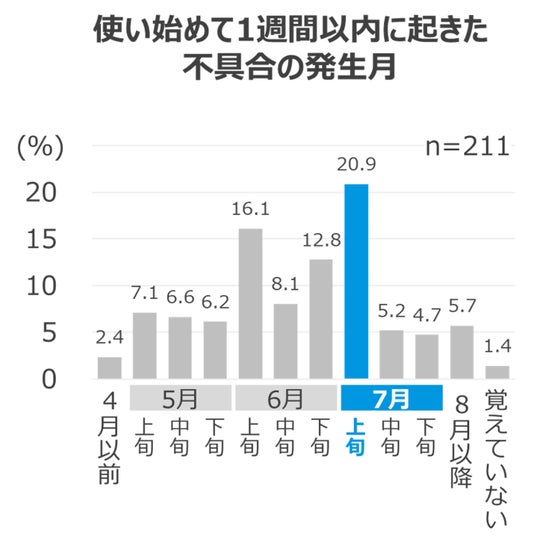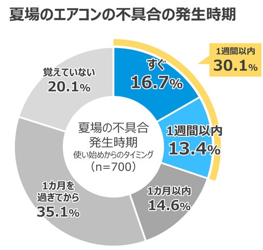エアコンの不具合の経験について聞いたところ、夏場にエアコンの不具合を経験した人は約4人に1人(23.3%)で、不具合が発生したタイミングは使い始めてから「1週間以内」が約3割(30.1%)を占め、1週間以内の発生月としては「7月上旬」が最も多い結果となりました。暖房シーズン後、使用していないエアコンを気温の高い時期にいきなり使い始めることで本体に負荷がかかりやすくなり、不具合が生じやすくなる可能性もあります。