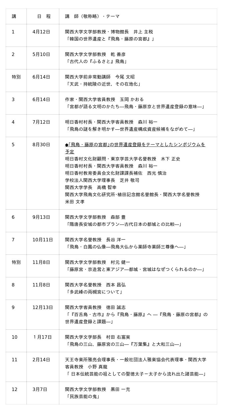 ■ <2026年度 飛鳥史学文学講座> スケジュール・講師・テーマほか
