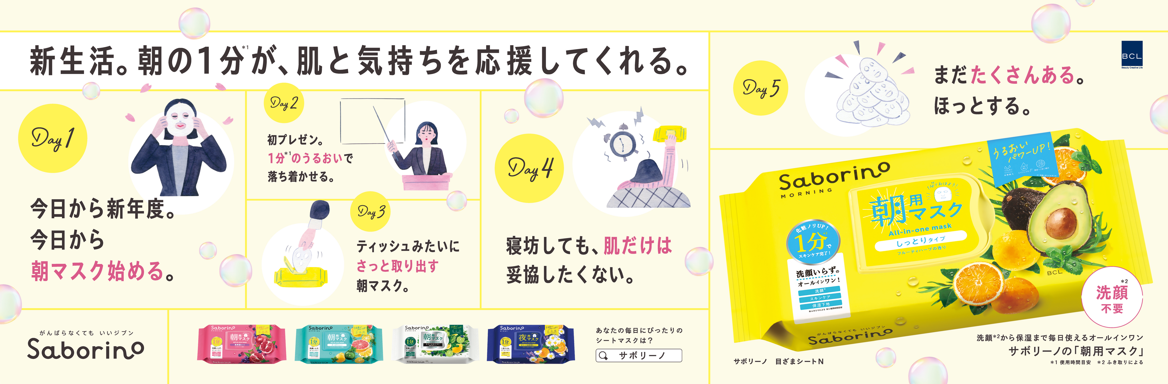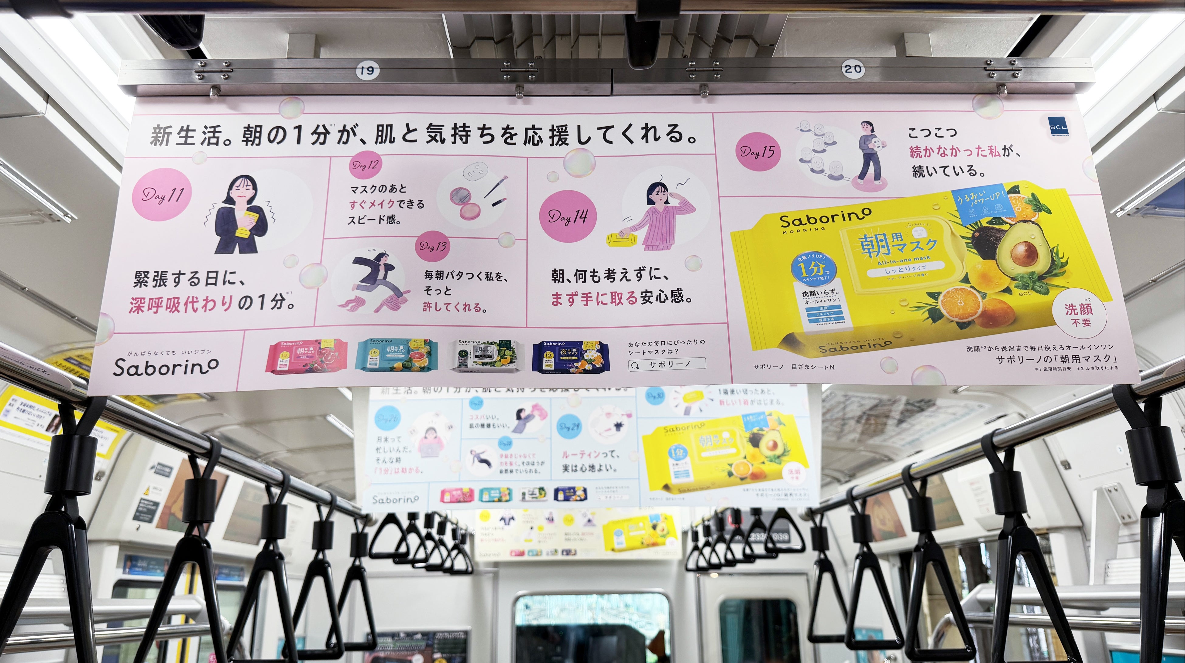 期待と不安が入り混じり、リズムが崩れがちな4月の新生活。サボリーノは、洗顔*1からスキンケア、保湿下地までを1分*で完了させる「朝用マスク」を通して、忙しい現代人の朝を支えてきました。 今回の中づりジャックでは、新生活に奮闘するすべての人々へ、余裕とエールを届けるクリエイティブを展開いたします。
