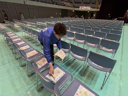新入生の入場前に、環境ISO学生委員会の学生18名が手分けして座席の上に配布しました。