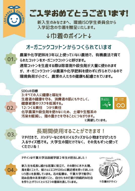 今年度は新入生にオーガニックコットンガゼット巾着をプレゼントしました。オーガニックコットンは、農薬や化学肥料を使わずに作られているため、環境負荷が少なく、農家の方の健康にも配慮しています。巾着のデザインは千葉大学法政経学部の2年生(当時)が担当し、新入生が成長していく過程でエコやSDGsに親近感を持ってほしいこと、自分たちの行動で持続可能な社会を作り上げていってほしいという願いが込められています。この巾着を新入生が大学在学中に限らず、卒業後も長く使用してくれると嬉しいです。
