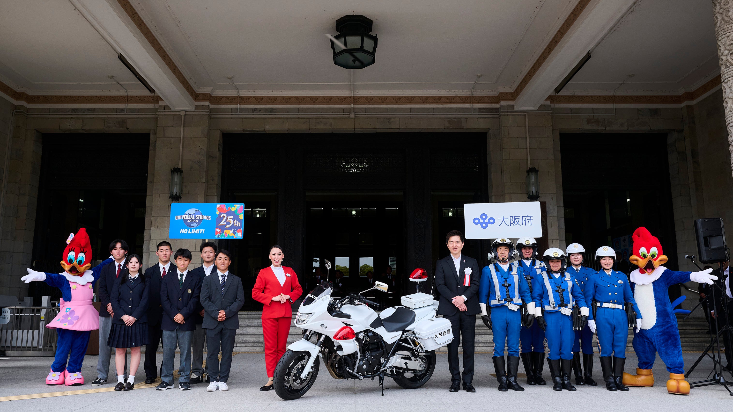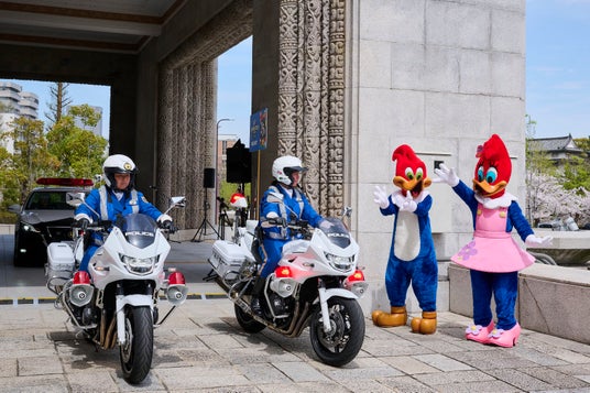 最後は、「ウッディー・ウッドペッカー」、「ウィニー・ウッドペッカー」も加わり、白バイ隊とパトカーの出発式を“超元気”に応援し、2026年の大阪府の交通安全を祈願しました。
