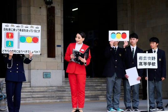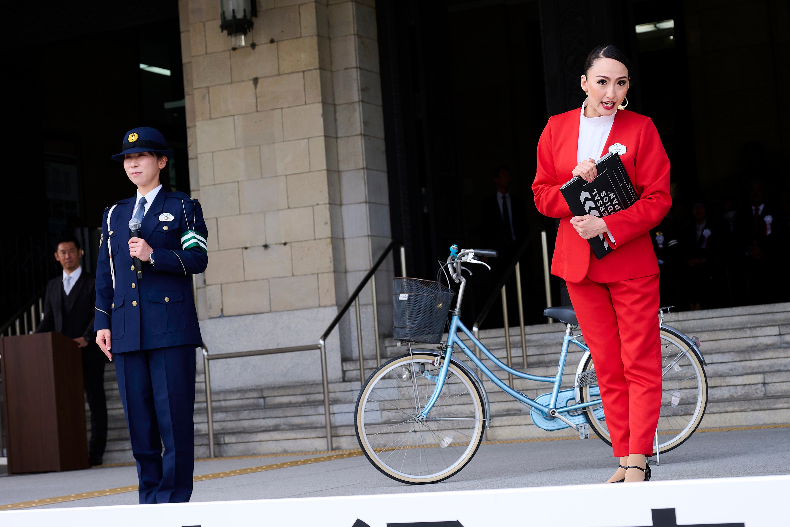 特別ゲストとして招かれた「綾小路麗華」は、まず今春から交通反則通告制度が適用される自転車の交通安全について「自転車の交通違反をなくすため、乗る方も乗らない方もルールを必ず知っておくこと!」と 府民の皆さまへ向けて呼びかけました。また、ドライバーだけでなく、歩行者に向けて「道路をわたるときは横断歩道を利用すること!」「歩きスマホは事故の原因になるからダメ!」、そして「(路上横臥による事故が増加していることに対して)道路で寝ないようにしなさい!」とメッセージを送りました。