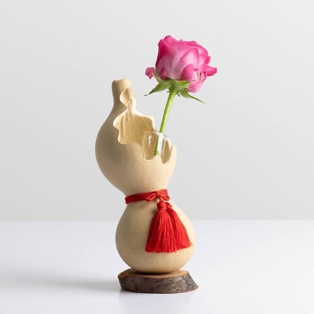 やわらかな曲線が、暮らしの片隅をそっと包み込む一輪挿しです。つくり手が手塩にかけて育てたひょうたんを素材に、一つひとつ手作業で仕上げた一点物。小さな花一輪で、部屋の空気がふっと柔らかくなる瞬間をお届けします。