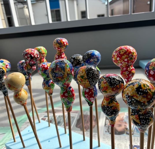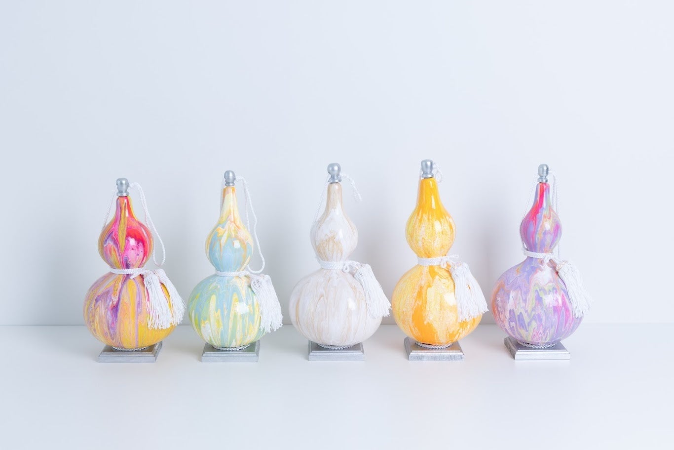 ひょうたんアートオブジェ鮮やかな色彩と手仕事の温もりが織りなす、一点物のアート作品。一つひとつ異なる色の重なり、流れるような模様が特徴です。同じものは二度と生まれないからこそ、手にした瞬間に特別な物語が始まります。インテリアのアクセントとして、あるいは静かな存在感を放つオブジェとして、空間をやさしく彩ります。